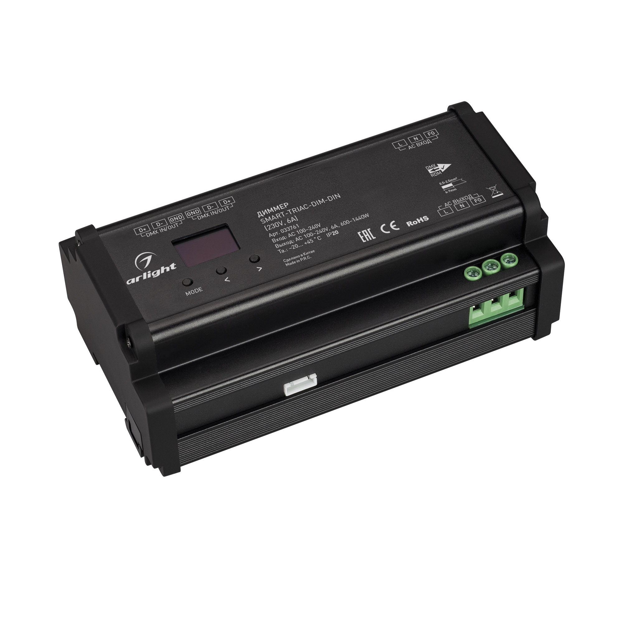 Диммер, предназначенный для включения/выключения и управления яркостью источников света с напряжением питания 230В, таких как: светодиодных диммируемых ламп, диммируемых светодиодных светильников, ламп накаливания и галогенных ламп. Четыре режима работы: ручной (с помощью элементов управления на корпусе устройства), DMX512. Протокол управления DMX512 с поддержкой RDM. Диммирование выполняется отсечкой фазы сетевого напряжения 230В. Способы управления по переднему и заднему фронту. Возможна установка минимальной яркости 1-40%. Питание от 230В, 1 канал управления, максимальная нагрузка 6А на канал, выходная мощность 1440 Вт для резистивной нагрузки ламп накаливания, 720 В*А для светодиодных источников света. Габариты: 168х93.5х63 мм. Пластиковый корпус черного цвета c LED монитором. Установка на DIN рейку.