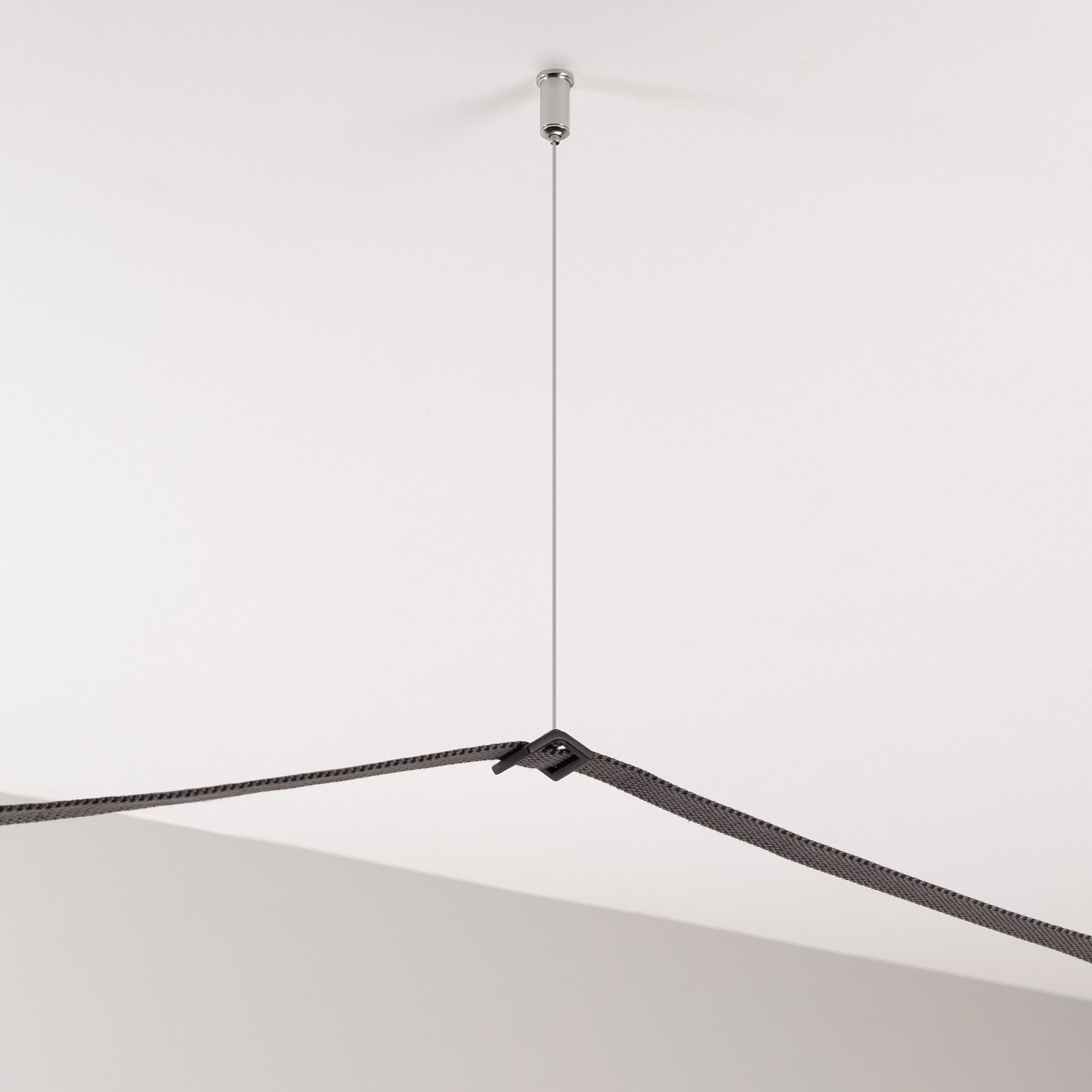 Подвес-фиксатор для токопроводящего ремня серии ART-INBELT. Размер: 28x28x12 мм. Цвет: черный. Материал: пластик + алюминий. Монтажный крепеж и стальной трос поставляются в комплекте. ∅1.2х2000мм
