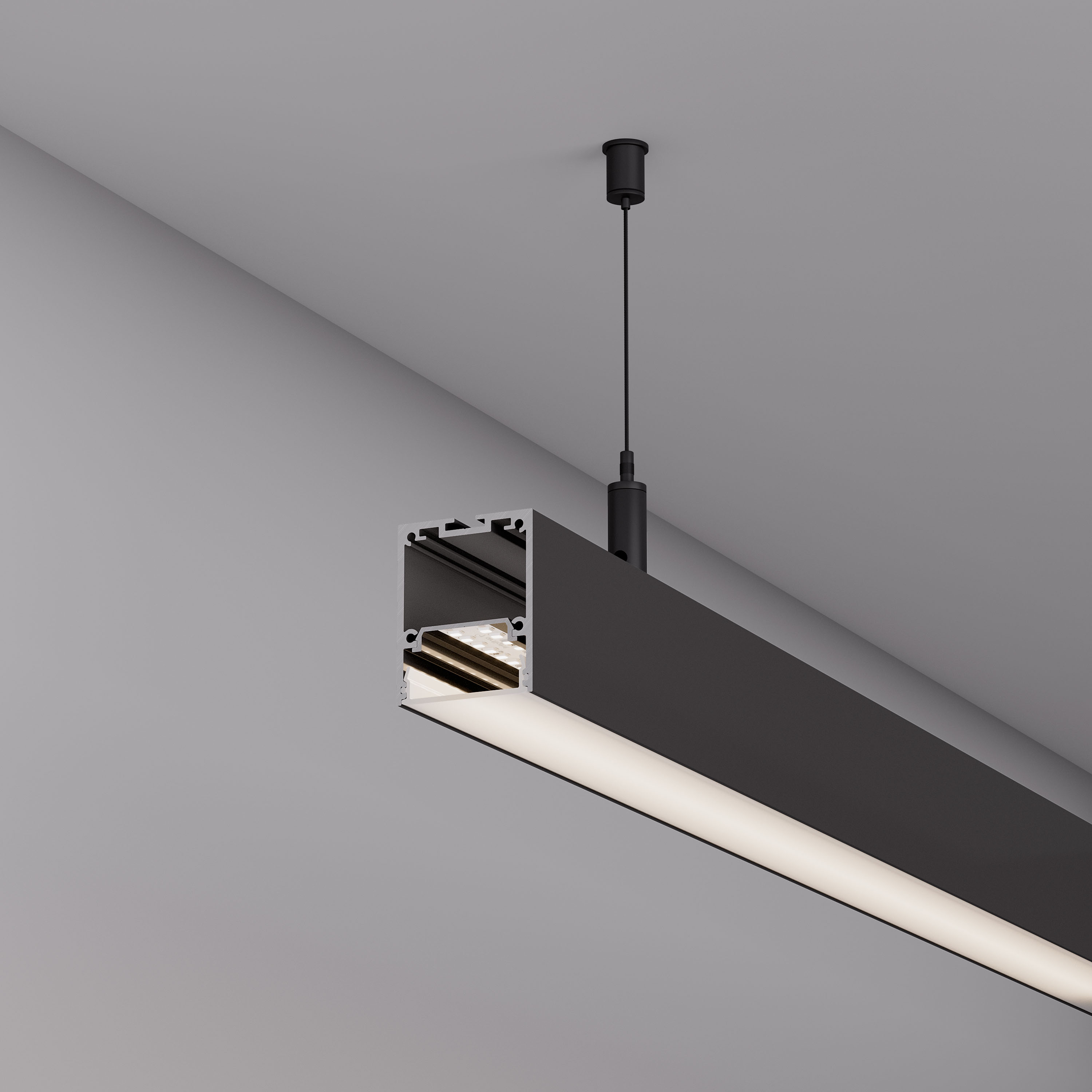 Накладной/подвесной профиль из алюминия черного цвета для основного освещения с возможностью герметизации до IP54 с помощью аксессуаров к профилю (уплотнительная резинка, заглушки, экраны, муфты) без дополнительного использования силиконового герметика, до IP65 с помощью аксессуаров к профилю (уплотнительная резинка, заглушки, экраны, муфты) при условии дополнительного использования силиконового герметика. Габаритные размеры профиля составляют 2000 мм в длину, 40 мм в ширину и 50 мм в высоту. Площадка для установки светодиодных лент позволяет использовать ленту шириной до 24 мм и мощностью до 36 Вт/м. Это обеспечивает гибкость в выборе светодиодных лент и позволяет создать потрясающие световые решения. Экран, заглушки и другие аксессуары не включены в комплект и приобретаются отдельно. Цена указана за 1 метр профиля. Отличное решение для создания современных световых проектов.