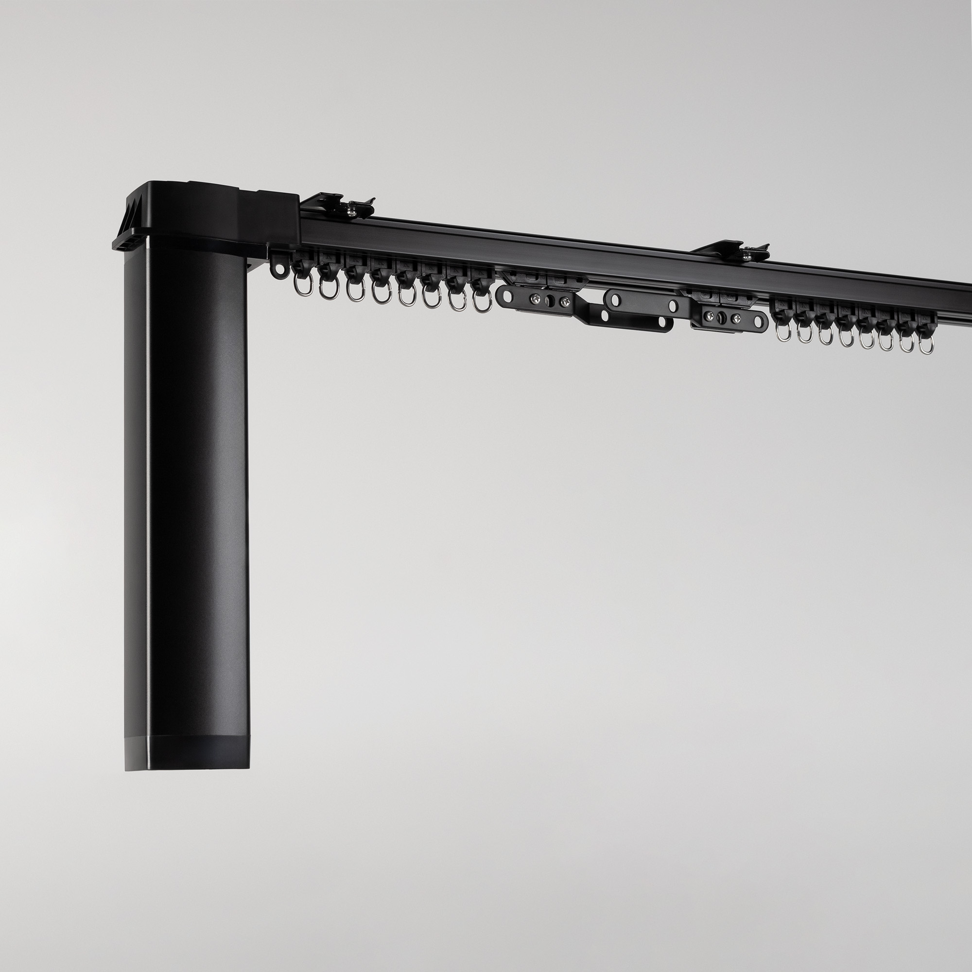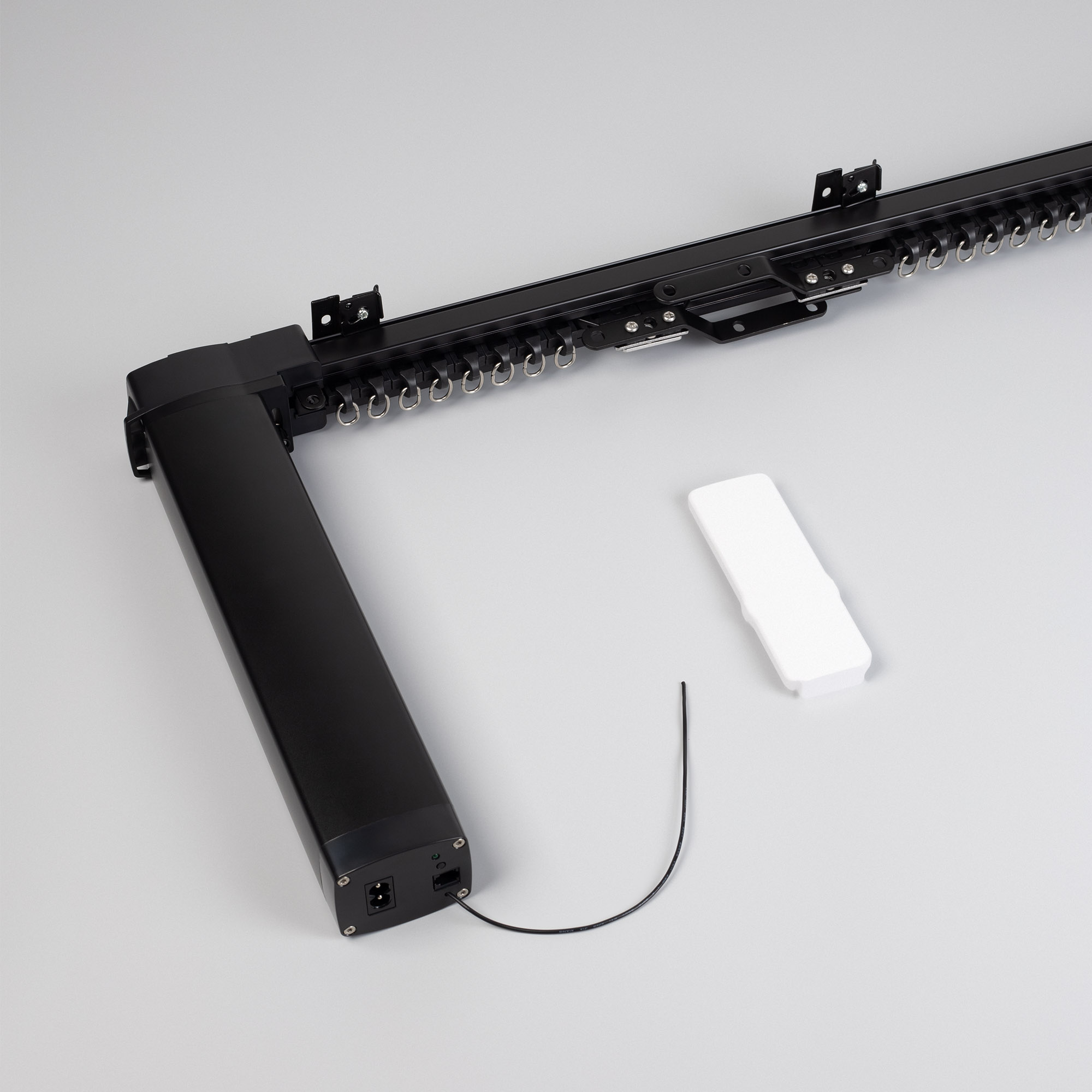 Полный комплект черного электрокарниза из металлического профиля с мотором. Готовое решение для установки карниза, который будет управляться дистанционно пультом, с помощью приложения на телефоне, голосовым помощником, либо вручную. Возможность выбора нужной длины благодаря наборным частям.